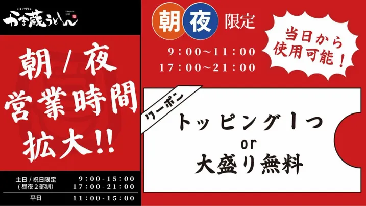 【営業時間変更のお知らせ】かま蔵うどんが朝&夜営業をスタート!お得な特典も♪